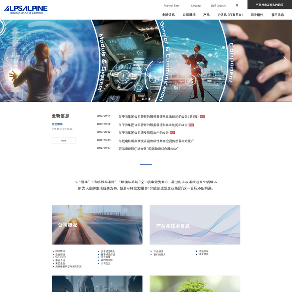 阿爾卑斯阿爾派致力發(fā)展“組件”、“傳感器與通信”、“模塊與系統(tǒng)”這三項(xiàng)事業(yè)。在車載、家電、移動(dòng)出行、游戲等眾多市場(chǎng)為客戶提供所需的產(chǎn)品和服務(wù),并向工業(yè)機(jī)械、IoT等新領(lǐng)域發(fā)起挑戰(zhàn)以拓展可能性。