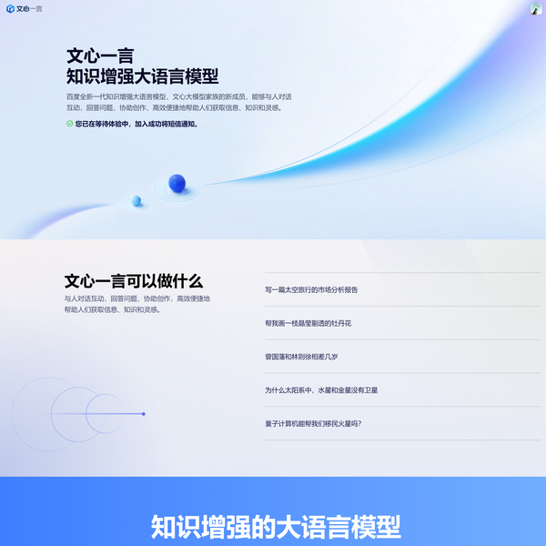 文心一言(https://yiyan.baidu.com/)已被三體網(wǎng)址大全收錄在網(wǎng)址百科信息庫中,所在分類目錄為”其他分類 > 人工智能AI > AI對話聊天“目錄,百科頁面地址:http://m.dgjclw.com/siteinfo/28538.html。三體網(wǎng)址大全匯聚國內(nèi)優(yōu)秀網(wǎng)站大全,是提升網(wǎng)站外部鏈接流行度以及影響力的權(quán)威分類目錄及收錄提交入口,歡迎廣大優(yōu)質(zhì)網(wǎng)站提交收錄申請。