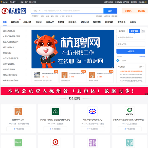 杭州人才網(wǎng)(杭聘網(wǎng)hangpin.com.cn官方網(wǎng)站)是杭州本地專業(yè)人才招聘求職網(wǎng),服務(wù)杭州各區(qū)、市縣的綜合招聘網(wǎng)站,職位多、更新快,上杭聘網(wǎng)找靠譜工作,招聘熱線:86166771。