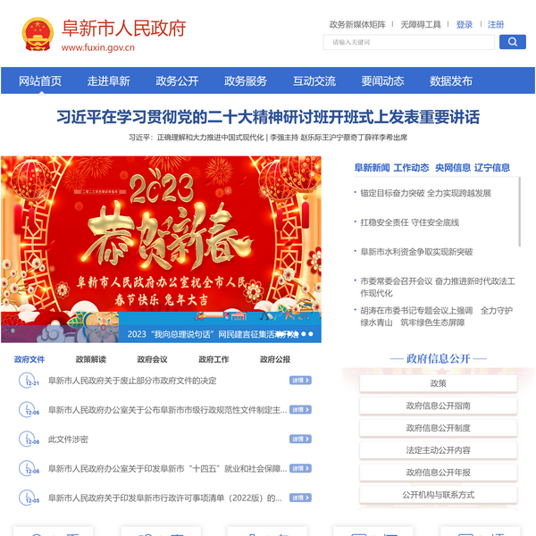 阜新市政府門戶網(wǎng)站1999年開通,2020年6月 改版運行?,F(xiàn)主要設(shè)有《走進阜新》、《政府信息》、《政務(wù)服務(wù)》、《新聞中心》、《互動交流》5個頻道,33個二級欄目。歡迎廣大公眾對本網(wǎng)站建設(shè)提出寶貴意見和建議。