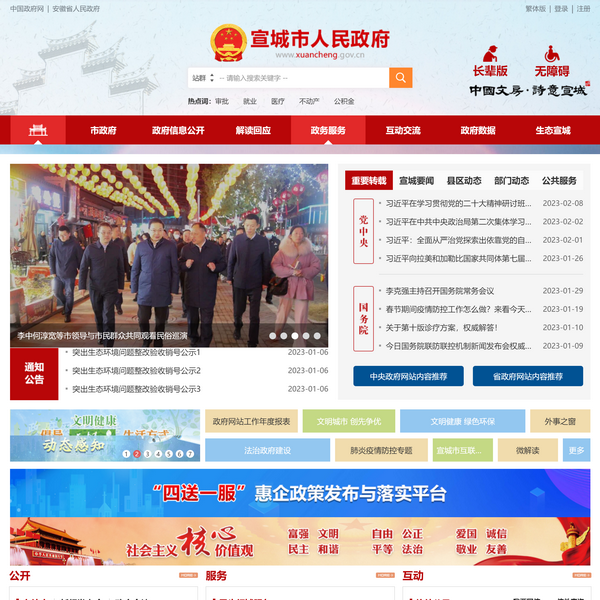 宣城市人民政府網(wǎng)站是由宣城市人民政府辦公室主辦、宣城市政府政務(wù)新媒體中心承辦的市政府門戶網(wǎng)站。是宣城市政府信息公開和宣傳宣城的重要窗口,是政務(wù)服務(wù)的重要平臺,是政府聯(lián)系公眾和企業(yè)的橋梁。 宣城市政府網(wǎng)站及時發(fā)布、更新各類政務(wù)信息,提供網(wǎng)上辦事服務(wù)和便民服務(wù)查詢,方便社會公眾參政議政、投訴建議和互動交流