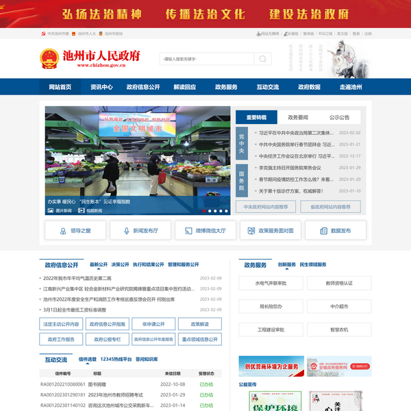 池州市人民政府網(wǎng)站是在池州市委、市政府領(lǐng)導(dǎo)親自關(guān)心、指導(dǎo)下建立和發(fā)展起來(lái)的政府門(mén)戶(hù)網(wǎng)站,始終堅(jiān)持以努力建設(shè)“服務(wù)政府、責(zé)任政府、法治政府”為目標(biāo),以“為民、便民、利民”為宗旨,以發(fā)布政府信息、拓展網(wǎng)上辦事、提供便民服務(wù)和開(kāi)展互動(dòng)交流為主要內(nèi)容。