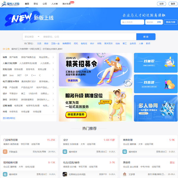 福州人才網(wǎng)?福建人才網(wǎng)集團(tuán)?福州人才網(wǎng)為求職者提供福州招聘信息。福州應(yīng)屆生求職找工作,找兼職,找零工-福州人才招聘平臺「福州人才網(wǎng)」讓你快速找到好工作!