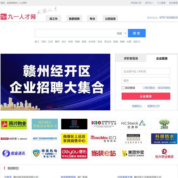 九一人才網(wǎng)是2003年在贛州本土創(chuàng)建的專業(yè)人才招聘網(wǎng)站,目前有簡歷數(shù)100多萬,企業(yè)數(shù)10萬多。輻射市區(qū)、開發(fā)區(qū)、南康區(qū)、贛縣區(qū)、蓉江區(qū)、瑞金、信豐、龍南、大余、于都、興國、崇義、寧都、安遠、尋烏、石城、會昌、定南、全南、上猶等省內(nèi)其他城市。
