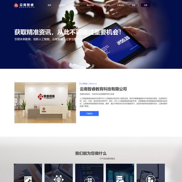云南智睿教育科技有限公司(以下簡稱智??萍迹境闪⒂?018年1月08日,是一家以技術(shù)驅(qū)動的整體招考解決方案服務商??偛课挥谠颇鲜±ッ魇?,主營業(yè)務:技術(shù)開發(fā)、軟硬件研發(fā)、大數(shù)據(jù)處理、人工智能、考試全流程服務等。