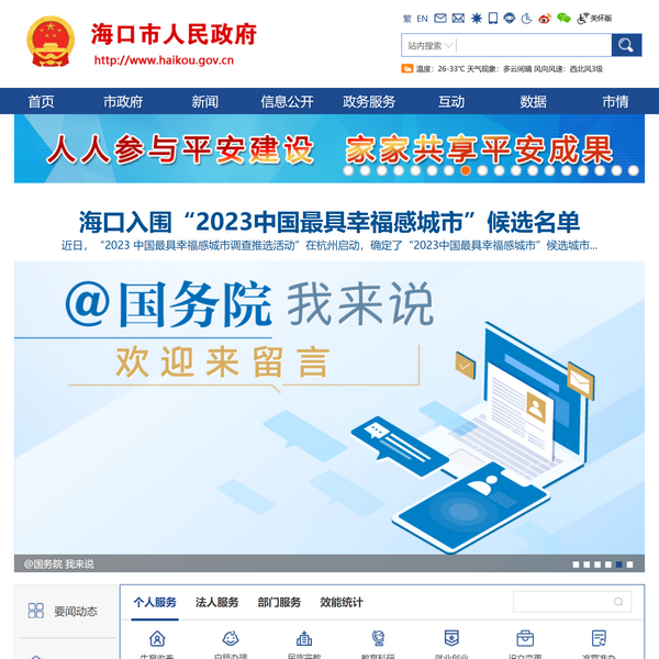 海口市政府門戶網(wǎng)站以努力建設(shè)“政務(wù)公開、服務(wù)市民、宣傳海口”為目標(biāo),以“為民、便民、利民”為宗旨,以發(fā)布政府信息、提供便民服務(wù)和拓展網(wǎng)上辦事為主要內(nèi)容。