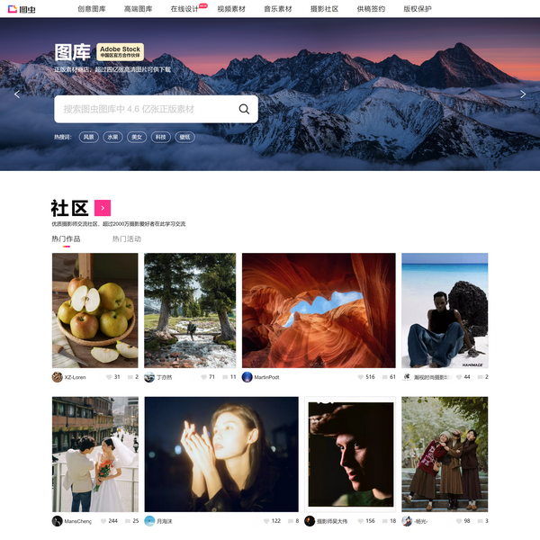 圖蟲成立于2009年,旗下?lián)碛袌D蟲社區(qū)、圖蟲創(chuàng)意、圖蟲Premium三個產(chǎn)品業(yè)務。作為影像傳播平臺,圖蟲社區(qū)目前已有2000萬注冊用戶,每天有來自全球各地的攝影創(chuàng)作者在圖蟲發(fā)布攝影、視頻作品。作為版權素材交易平臺(圖蟲創(chuàng)意和圖蟲Premium),圖蟲代理全球超過300家資源方的視覺版權資源,滿足各類場景視覺營銷需求。2020年6月,圖蟲成為Adobe Stock在中國的官方合作伙伴,讓視覺版權資源更具國際化和多元化。