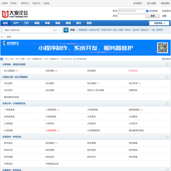 大家網(wǎng)學派教育旗下大家論壇是致力于提供在線學習交流、考試、培訓、答疑、資料共享下載服務的綜合論壇門戶平臺,目前已經(jīng)擁有強大的英語,計算機,注會、初中高級會計師、經(jīng)濟師、稅務師等財會金融考試,小初高本碩博等學歷教育,考研、考博,公務員、法考等資格考試,一建、一消、BIM等工程建設考試,醫(yī)學藥學護理考試等子論壇頻道。建站以來,大家學習網(wǎng)一直保持強勁的增長勢頭,以體貼周到的人性化服務,以及先進的辦網(wǎng)理念贏得越來越多網(wǎng)友的信任與支持,目前已擁有近1000萬用戶,大家網(wǎng)正以堅實的步伐向全球***學習、考試、教育、培訓門戶的方向邁進!