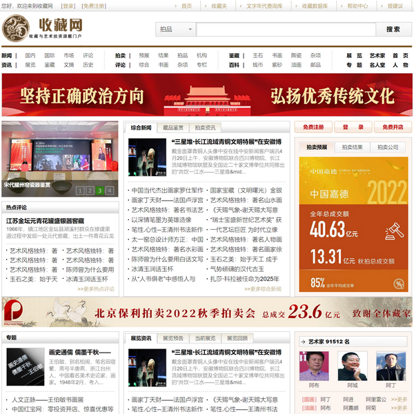 中國收藏網(wǎng)秉承“網(wǎng)盡天下收藏,服務(wù)無所不在”的理念,目前已成為國內(nèi)外藝術(shù)品市場(chǎng)的重要力量。 我們精心策劃,推出了 10 個(gè)各具特色的網(wǎng)上頻道,為用戶提供包括拍賣預(yù)展、藝術(shù)家介紹、藏品欣賞、人物訪談等多方面的信息咨詢服務(wù),同時(shí)開設(shè) BBS 與特色博客來搭建藝術(shù)愛好者與藏家之間的溝通橋梁,更有網(wǎng)上鑒定、藏品交易等特色服務(wù)平臺(tái),力求滿足用戶不同層面的需要。此外,還有四大特色服務(wù)中心,涵蓋藝術(shù)收藏品展示、交易、信息渠道等各個(gè)領(lǐng)域,全面豐富用戶的互聯(lián)網(wǎng)收藏體驗(yàn)。