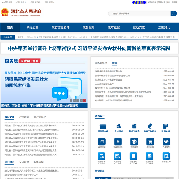 “中國河北”門戶網(wǎng)站主要設(shè)有走進(jìn)河北、信息公開、全省各地、部門信息、互動(dòng)交流、在線服務(wù)、專題專欄7大版塊。