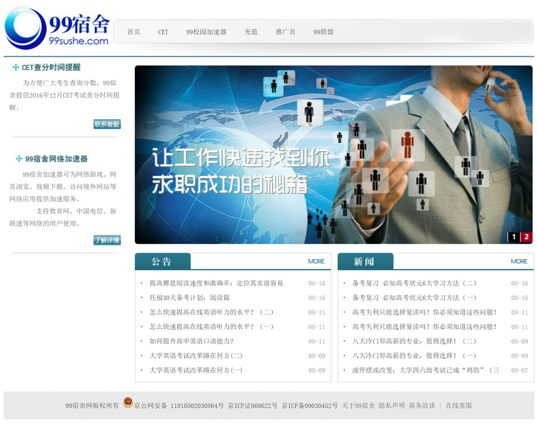 99宿舍網(wǎng)2006年由幾位哈佛留學回國人員創(chuàng)立,多家風投機構(gòu)共同投資,是中國最早專門服務于高校與大學生的網(wǎng)絡及線下綜合服務平臺之一。主要向大學生提供在線娛樂、校園資訊、學習交流、CET免費網(wǎng)絡查分(不含手機查分)、網(wǎng)絡加速器、院校活動、賽事舉辦及為企業(yè)提供產(chǎn)品與品牌活動推廣服務等。