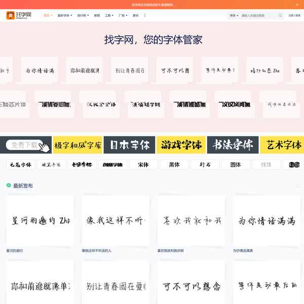 找字網(wǎng)提供中英文免費字體下載、手寫字體下載、書法字體下載、藝術字體下載、手機字體下載預覽服務!字體商用在線全自動授權!老牌專業(yè)字體市場、字體網(wǎng)站。