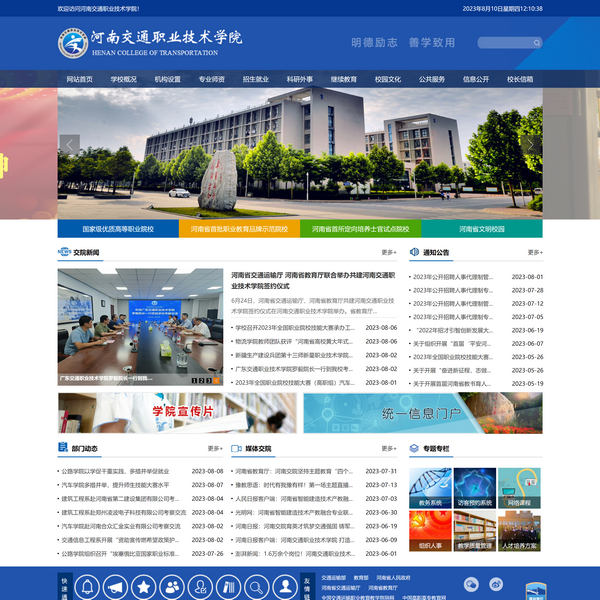 建校以來,學校在“以人為本、通達于道”辦學理念指引下,發(fā)揚“明德 勵志 善學 致用”校訓傳統(tǒng),傳承“自強不息、奮發(fā)有為、經(jīng)世致用、唯實唯新”交院精神,堅持“立足交通,面向社會,特色辦學,質量立校”辦學定位,為河南交通運輸行業(yè)和經(jīng)濟社會發(fā)展培養(yǎng)了10多萬名技術技能型人才,一大批校友成為我省交通運輸系統(tǒng)的技術專家和管理干部,為河南交通運輸事業(yè)發(fā)展提供了強有力的人才支撐、智力保障和技術服務。原全國人大常委會副委員長陳至立,原教育部部長周濟,原河南省委書記郭庚茂,原河南省省長陳潤兒,現(xiàn)河南省副省長霍金花,火箭軍副政委禹光中將曾先后到學院考察調研,對學院的辦學條件,改革發(fā)展以及人才培養(yǎng)模式給予了充分肯定。學校憑借先進的辦學理念,優(yōu)異的育人質量,良好的社會口碑,被河南日報社評為“河南省人民滿意的十佳職業(yè)院校”“高質量就業(yè)示范高校”,被譽為“河南交通人才搖籃”。