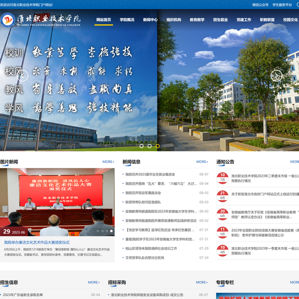 淮北職業(yè)技術(shù)學院是1999年經(jīng)教育部批準設立、淮北市人民政府舉辦的全日制普通高等職業(yè)院校,由原淮北教育學院、淮北礦務局職工大學、安徽電大淮北分校、淮北財政學校、淮北技工學校合并組建,是安徽省示范性高職院校、安徽省地方技能型高水平大學建設單位。