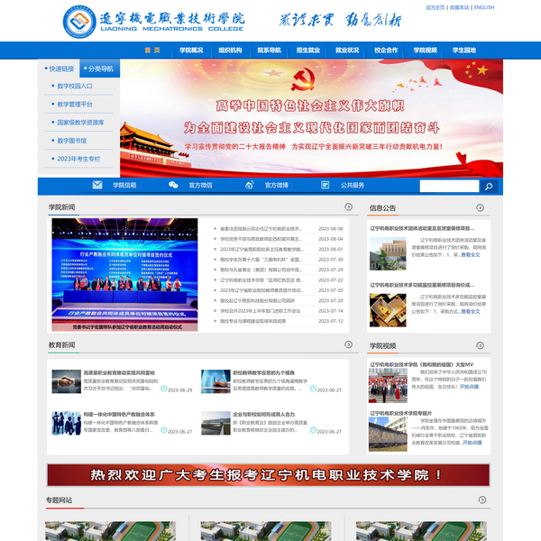遼寧機電職業(yè)技術(shù)學(xué)院是經(jīng)遼寧省人民政府批準,教育部備案的一所工科類高等職業(yè)院校。學(xué)校始建于1965年,前身是國家重點中專遼寧儀器儀表工業(yè)學(xué)校,2002年獨立升格為高等職業(yè)技術(shù)學(xué)院。現(xiàn)為“國家雙高計劃”高水平專業(yè)群建設(shè)單位、全國第二批深化創(chuàng)新創(chuàng)業(yè)教育改革示范高校、國家優(yōu)質(zhì)專科高等職業(yè)院校、全國首批1+X證書制度試點院校、全國重點建設(shè)職業(yè)教育師資培養(yǎng)培訓(xùn)基地、國家數(shù)控技術(shù)緊缺人才培養(yǎng)基地、全國機械行業(yè)骨干職業(yè)院校、全國機械行業(yè)校企合作與人才培養(yǎng)優(yōu)秀職業(yè)院校、全國機械行業(yè)服務(wù)先進制造高水平骨干職業(yè)院校、國家首批示范性職業(yè)教育集團(聯(lián)盟)培育單位、教育部首批教育信息化試點建設(shè)單位、遼寧省高水平現(xiàn)代化高職院校、遼寧省職業(yè)教育改革發(fā)展示范學(xué)校、遼寧省高等職業(yè)教育興遼卓越院校建設(shè)項目學(xué)校。
