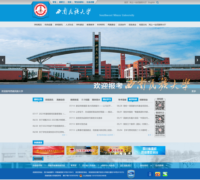 西南民族大學坐落于有“天府之國”美譽的國家歷史文化名城——成都,是國家民委直屬綜合性普通高校,國家民委、教育部、四川省、成都市共建高校。學校前身為西南民族學院,創(chuàng)建于1950年7月,于1951年6月1日正式成立,2003年4月更名為西南民族大學,是在毛澤東、周恩來、鄧小平等老一輩無產(chǎn)階級革命家親自關(guān)懷下,新中國最早建立的民族高校之一。鄧小平***先后兩次為學校題詞。時任西南軍政委員會副主席兼西南民委主任王維舟為首任院長。2003年學校在首輪教育部本科教學工作水平評估中獲得優(yōu)秀;2013年入選“全國畢業(yè)生就業(yè)典型經(jīng)驗50強高?!?;2017年入選“全國創(chuàng)新創(chuàng)業(yè)典型經(jīng)驗50高?!?、榮獲第五批“全國民族團結(jié)進步創(chuàng)建示范學校”;2017年、2020年連續(xù)兩屆榮膺“全國文明校園”稱號。