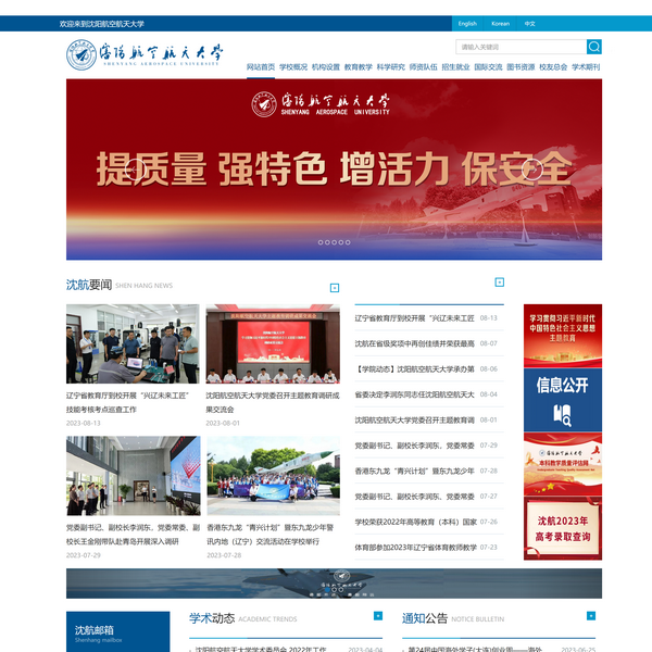 沈陽(yáng)航空航天大學(xué)始建于1952年,學(xué)?,F(xiàn)已建設(shè)成為以航空宇航為特色,以工為主,工、理、文、經(jīng)、管、藝等學(xué)科協(xié)調(diào)發(fā)展的多科性高等院校,是遼寧省人民政府與教育部、中國(guó)航空工業(yè)集團(tuán)公司三方共建高校,是遼寧省人民政府與國(guó)家國(guó)防科工局共建高校。學(xué)校先后獲評(píng)全國(guó)先進(jìn)基層黨組織、全國(guó)模范職工之家、全國(guó)優(yōu)秀易班共建高校等榮譽(yù)稱號(hào)。