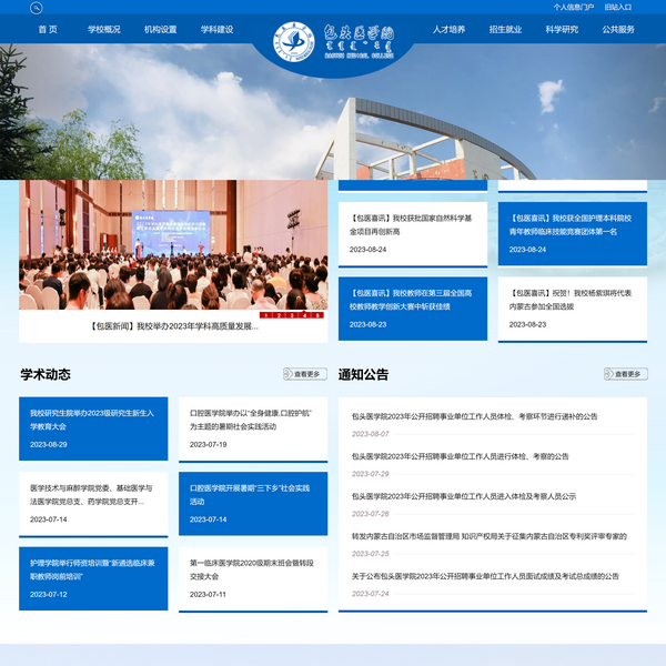 學(xué)校坐落于有著“草原鋼城”“稀土之都”美譽(yù)的內(nèi)蒙古自治區(qū)包頭市,現(xiàn)有東河、青山兩個(gè)校區(qū),學(xué)校占地面積70萬(wàn)平方米,建筑面積30.15萬(wàn)平方米。經(jīng)過(guò)60多年的建設(shè)和發(fā)展,學(xué)校現(xiàn)已形成全日制本科教育、研究生教育、繼續(xù)教育和職業(yè)教育多層次辦學(xué)格局和以醫(yī)學(xué)為主,法學(xué)、教育學(xué)、文學(xué)、理學(xué)、管理學(xué)和工學(xué)協(xié)調(diào)發(fā)展的學(xué)科體系。1997年通過(guò)原國(guó)家教委本科教學(xué)工作合格評(píng)估,2008年在教育部本科教學(xué)工作水平評(píng)估中被評(píng)為“優(yōu)秀”,2017年接受教育部本科教學(xué)工作審核評(píng)估,2020年通過(guò)教育部臨床醫(yī)學(xué)專業(yè)認(rèn)證。