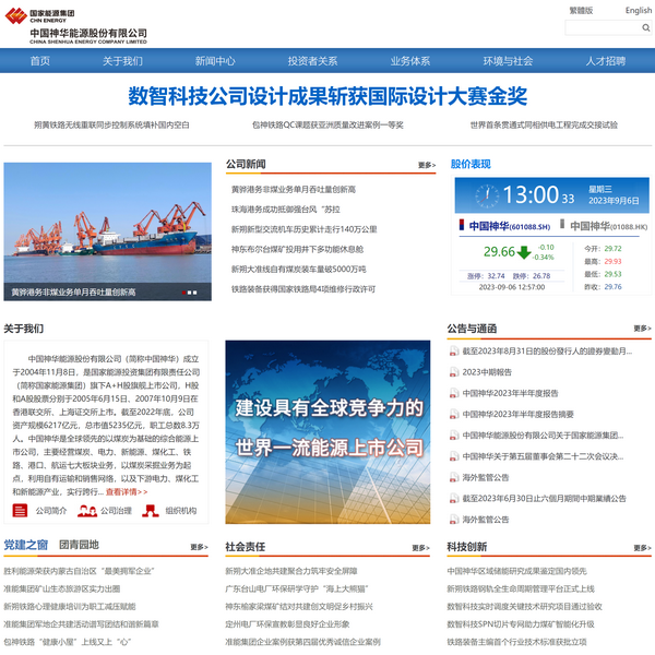 中國神華能源股份有限公司(簡稱中國神華)成立于2004年11月8日,是國家能源投資集團(tuán)有限責(zé)任公司(簡稱國家能源集團(tuán))旗下A+H股旗艦上市公司,H股和A股股票分別于2005年6月15日、2007年10月9日在香港聯(lián)交所、上海證交所上市。截至2022年底,公司資產(chǎn)規(guī)模6217億元,總市值5235億元,職工總數(shù)8.3萬人。