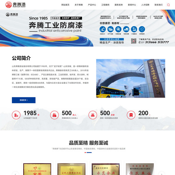 多年來,公司持續(xù)完善質(zhì)量管理體系、環(huán)境管理體系、職業(yè)健康安全管理體系、能源管理體系,注重環(huán)境保護(hù)及履行社會責(zé)任。依托優(yōu)異的產(chǎn)品質(zhì)量、良好的品牌形象及專業(yè)的技術(shù)服務(wù),“奔騰牌”先后被評為山東省著名商標(biāo)、中國馳名商標(biāo)、中國涂料行業(yè)的十強品牌,公司自2011年連續(xù)榮獲“省級守合同重信用企業(yè)”稱號。