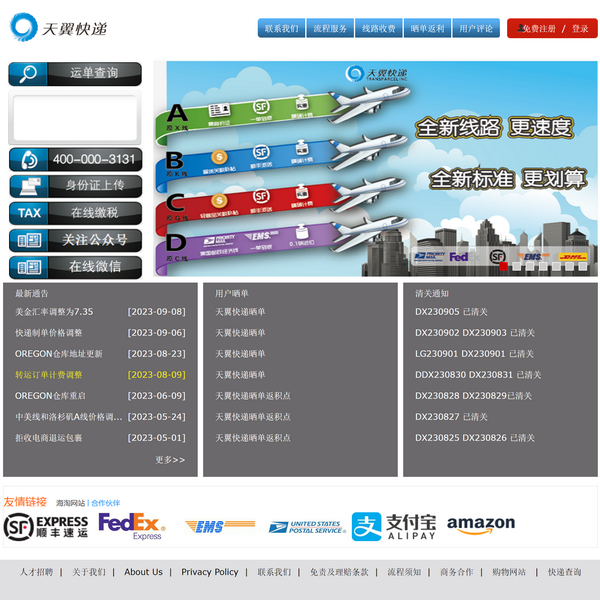 天翼快遞總部位于美國加州,并在免稅州設(shè)有分公司,主要經(jīng)營北美到中,港,臺(tái)的傳統(tǒng)國際快遞、以及國際電子商務(wù)倉儲(chǔ)、物流及相關(guān)業(yè)務(wù)。