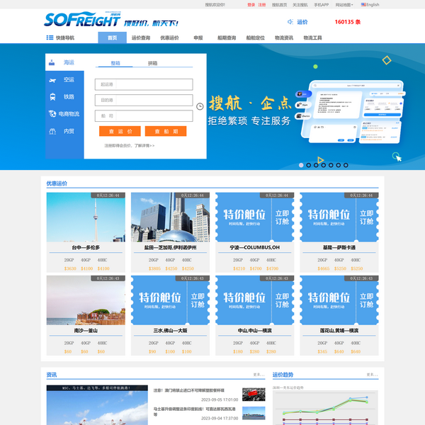 搜航網(wǎng)提供在線海運(yùn)費(fèi)查詢,船期查詢,提供上海,深圳,廣州,寧波,青島,天津,廈門,大連,香港等港口國(guó)際海運(yùn)費(fèi)查詢,在線訂艙,船期查詢,空運(yùn)運(yùn)價(jià)查詢,鐵路運(yùn)價(jià)查詢服務(wù).提供貨物跟蹤,申報(bào)以及支付在內(nèi)的全鏈條電子化可視化在線服務(wù)。