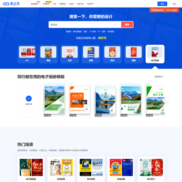 易企秀創(chuàng)意營銷平臺提供免費H5微場景、海報、長圖、表單、視頻、互動游戲、建站、小程序八大制作工具及秀推智能營銷平臺,助力企業(yè)高效完成內(nèi)容創(chuàng)意、傳播獲客、數(shù)據(jù)管理、效果轉(zhuǎn)化的自營銷閉環(huán)。