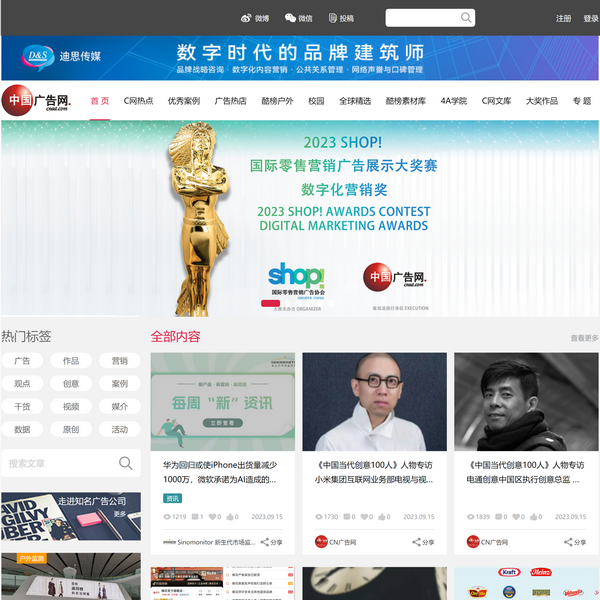 CNAD廣告網(wǎng)(CNAD.com)自1999年創(chuàng)立以來(lái),便以敏銳的觸角掌握中國(guó)廣告、媒體界的全新動(dòng)態(tài),為中國(guó)本土、臺(tái)灣、香港乃至國(guó)際廣告、媒體界的互動(dòng)溝通發(fā)揮著積極作用。目前各類(lèi)注冊(cè)會(huì)員近200萬(wàn)人,每日平均訪問(wèn)近150萬(wàn)人次,瀏覽頁(yè)面400萬(wàn)頁(yè),現(xiàn)已發(fā)展成為國(guó)內(nèi)享有知名度且規(guī)模比較大的廣告媒體行業(yè)專(zhuān)業(yè)網(wǎng)站之一。 經(jīng)過(guò)十多年的發(fā)展,目前我們已經(jīng)形成了以神手指自媒體平臺(tái)、媒體交易平臺(tái)、廣告設(shè)備交易三個(gè)板塊為骨干,新聞資訊、人物風(fēng)云、媒體經(jīng)營(yíng)、媒婆360、4 A 報(bào)道、廣告案例等板塊全面發(fā)展,以廣告人微博、廣告博客、廣告沙龍為特色的網(wǎng)站架構(gòu),為廣告公司、媒體公司、中大型企業(yè)的廣告及市場(chǎng)推廣人員、高校營(yíng)銷(xiāo)廣告相關(guān)專(zhuān)業(yè)的教師學(xué)生提供全方位的廣告行業(yè)信息服務(wù)。