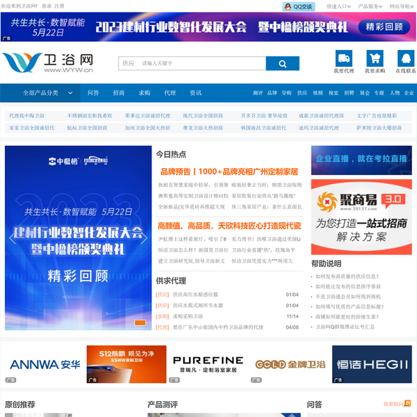 衛(wèi)浴網(wǎng)-提供***衛(wèi)浴潔具供應(yīng),求購,衛(wèi)浴潔具品牌代理,導(dǎo)購,招商等商機(jī)信息,匯集全國衛(wèi)浴行業(yè)企業(yè)的各種求購,招商,供應(yīng),展會等信息,可通過衛(wèi)浴資訊,衛(wèi)浴導(dǎo)購,衛(wèi)浴招商等頻道了解企業(yè)各種信息服務(wù),它是衛(wèi)浴潔具行業(yè)的門戶網(wǎng)站。