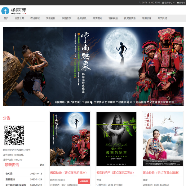【楊麗萍藝術(shù)】是云南楊麗萍文化傳播股份有限公司官方網(wǎng)站,公司于2014年在新三板掛牌上市,證券名稱:云南文化,證券代碼:831239,公司旗下《云南映象》常年在云南省昆明市云南藝術(shù)劇院定點(diǎn)演出;《云南的響聲》常年在云南省麗江市云嶺劇場定點(diǎn)演出;《黃山映象》常年在安徽省黃山市黃山國際大舞臺(tái)定點(diǎn)演出;《孔雀》、《十面埋伏》、《孔雀之冬》全球巡演。