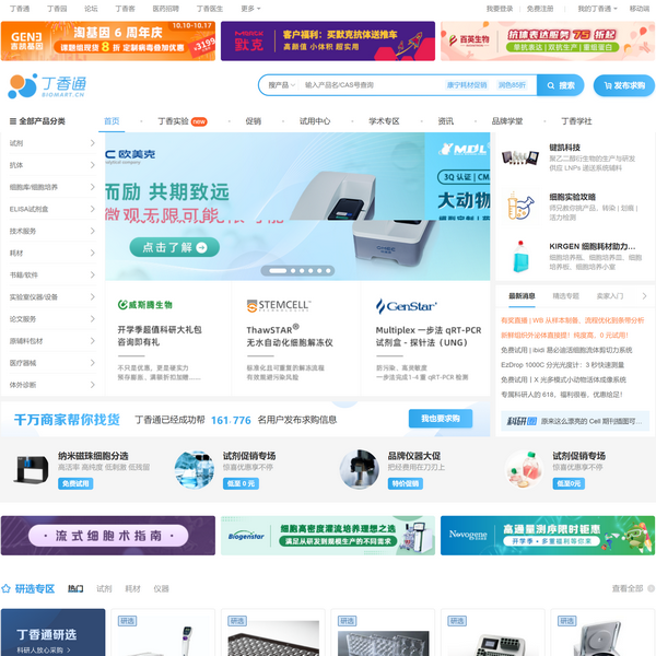丁香通是丁香園旗下專業(yè)的生物醫(yī)藥科研線上采購平臺,擁有試劑抗體、實驗儀器、ELISA試劑盒、醫(yī)療設備、輔料原料等各類產(chǎn)品供求、價格/報價等信息近6000萬條,4萬多家品牌供應商入駐,致力為醫(yī)藥企業(yè)和生物醫(yī)藥相關行業(yè)人士提供優(yōu)質(zhì)的采購渠道和服務。