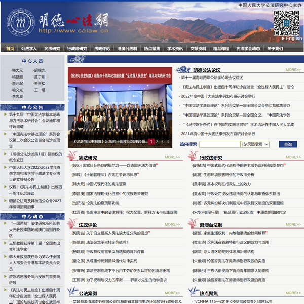 明德公法網(wǎng)采用國內(nèi)***域名:www.calaw.cn。域名中的首字母C代表憲法學(xué)(Constitutional Law),次字母A代表行政法學(xué)(Administrative Law)。網(wǎng)站共設(shè)中心動(dòng)態(tài)、中心公告、公法學(xué)人、明德公法論壇、憲法研究、行政法研究、法學(xué)評(píng)論、案例研究、港澳臺(tái)法制、資料信息、熱點(diǎn)聚焦、隨筆雜談、憲法學(xué)會(huì)動(dòng)態(tài)等欄目。