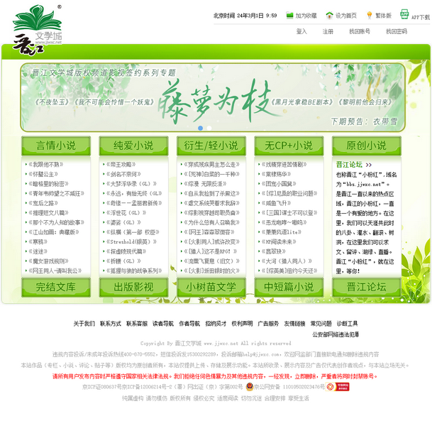 晉江文學城(www.jjwxc.net)創(chuàng)立于2003年8月,是具備相當規(guī)模女性網絡文學原創(chuàng)基地。站內作品題材多樣,包括原創(chuàng)言情小說、都市小說、奇幻小說、純愛小說、百合小說、輕小說以及衍生小說等,已誕生出《花千骨》《知否?知否?應是綠肥紅瘦》《何以笙簫默》等上百部熱門影視劇作品。晉江文學城已經從一個簡單的文學愛好者集散地快速且穩(wěn)健地成長為行業(yè)內的翹楚。