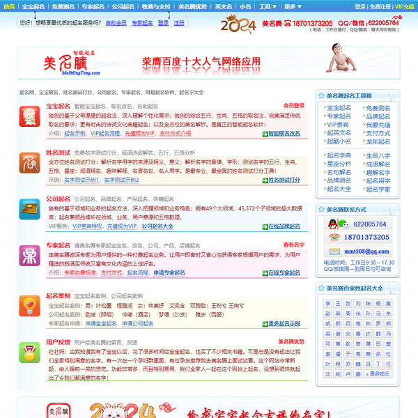 公司目前的核心產(chǎn)品和服務(wù)包括:寶寶起名,姓名測(cè)試打分,專家起名,公司起名,公司測(cè)名,百家姓起名大全,起名字典,生辰八字,起名知識(shí)庫,詩詞起名大全,起昵稱/小名,英文名,周易起名等服務(wù)。本公司的愿景是在起名系統(tǒng)的基礎(chǔ)上逐步發(fā)展為兒童和青少年成長過程全方位的信息咨詢和服務(wù)平臺(tái)。美名騰起名網(wǎng)核心技術(shù)和產(chǎn)品已經(jīng)申請(qǐng)了商標(biāo)、專利和軟件著作權(quán)保護(hù)。