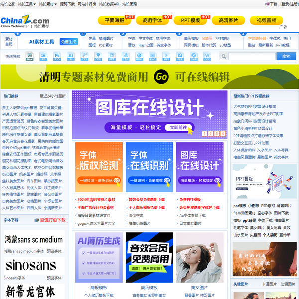 站長素材是一家大型綜合設(shè)計(jì)類素材網(wǎng)站,提供高清圖片素材、PSD素材、PPT模板、網(wǎng)頁模板、腳本素材、簡歷模板、矢量素材、3D素材、酷站欣賞、Flash動畫等設(shè)計(jì)素材免費(fèi)下載和在線預(yù)覽服務(wù)。