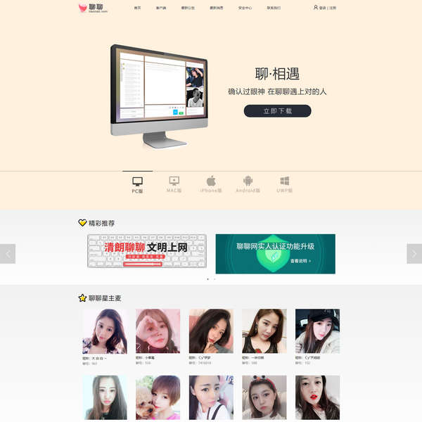 聊聊網(wǎng)是最早的免費(fèi)語音聊天室。聊聊視頻聊天室擁有高質(zhì)量語音視頻,帥哥美女在線視頻聊天、在線直播,是同城交友、視頻語音、免費(fèi)聊天、K歌游戲的聊天平臺(tái)。